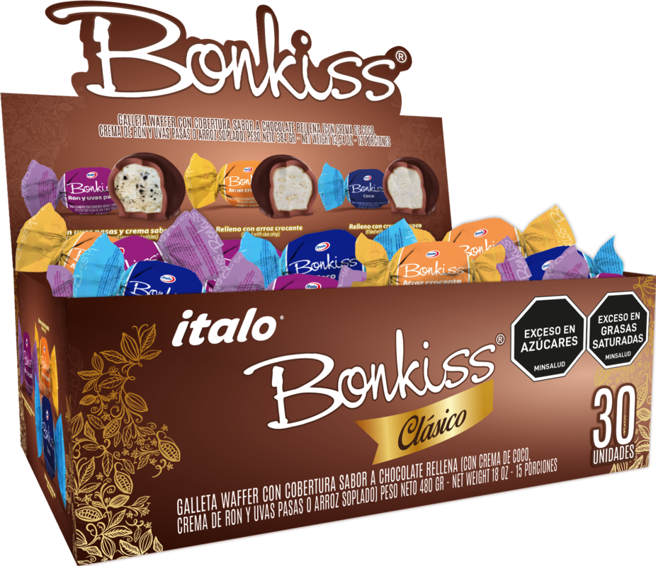 Galleta rellena con crema de coco, crema de ron con uvas pasas o arroz crocante cubierto con sabor a chocolate.