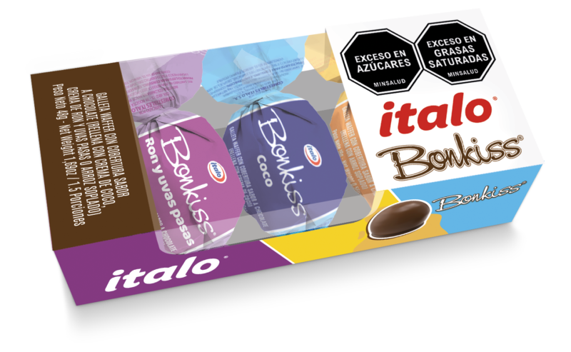 Galleta cubierta de chocolate rellena con crema de tres ricos sabores: coco, arroz tostado, uvas pasas y crema sabor a ron.