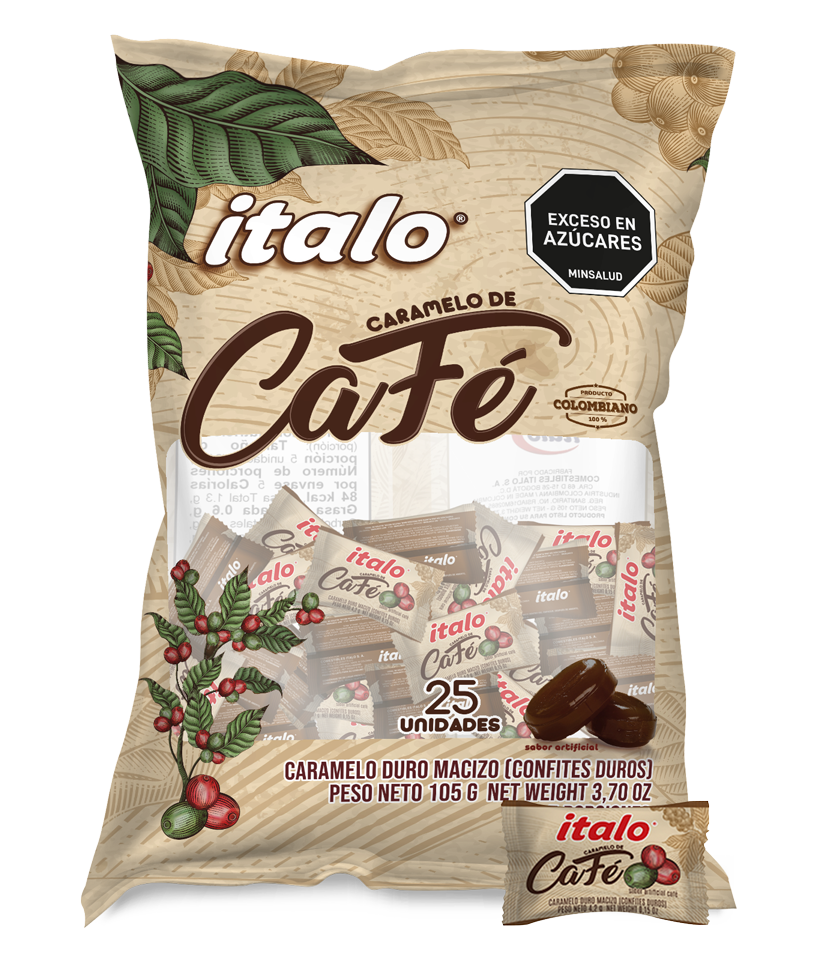 Confite macizo con café molido 100% colombiano, con un aroma que provoca y recuerda las montañas de nuestras tierras cafeteras.