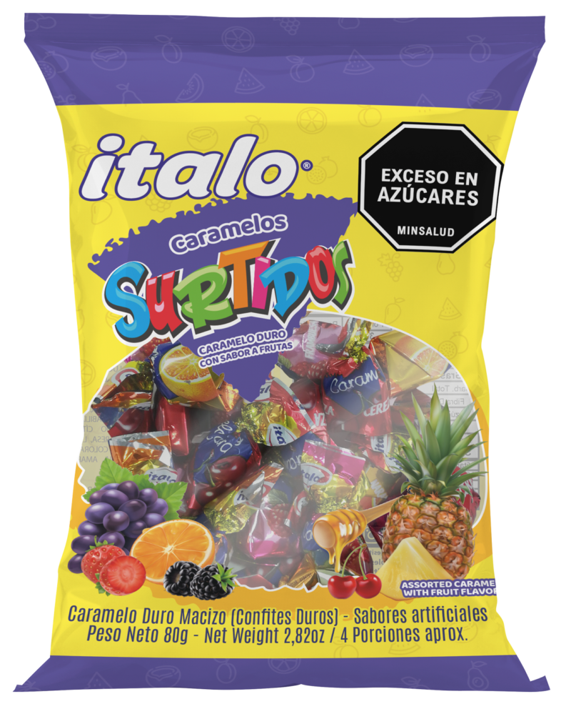 Caramelos con sabor a frutas: fresa, frambuesa, limón, naranja, piña y miel.